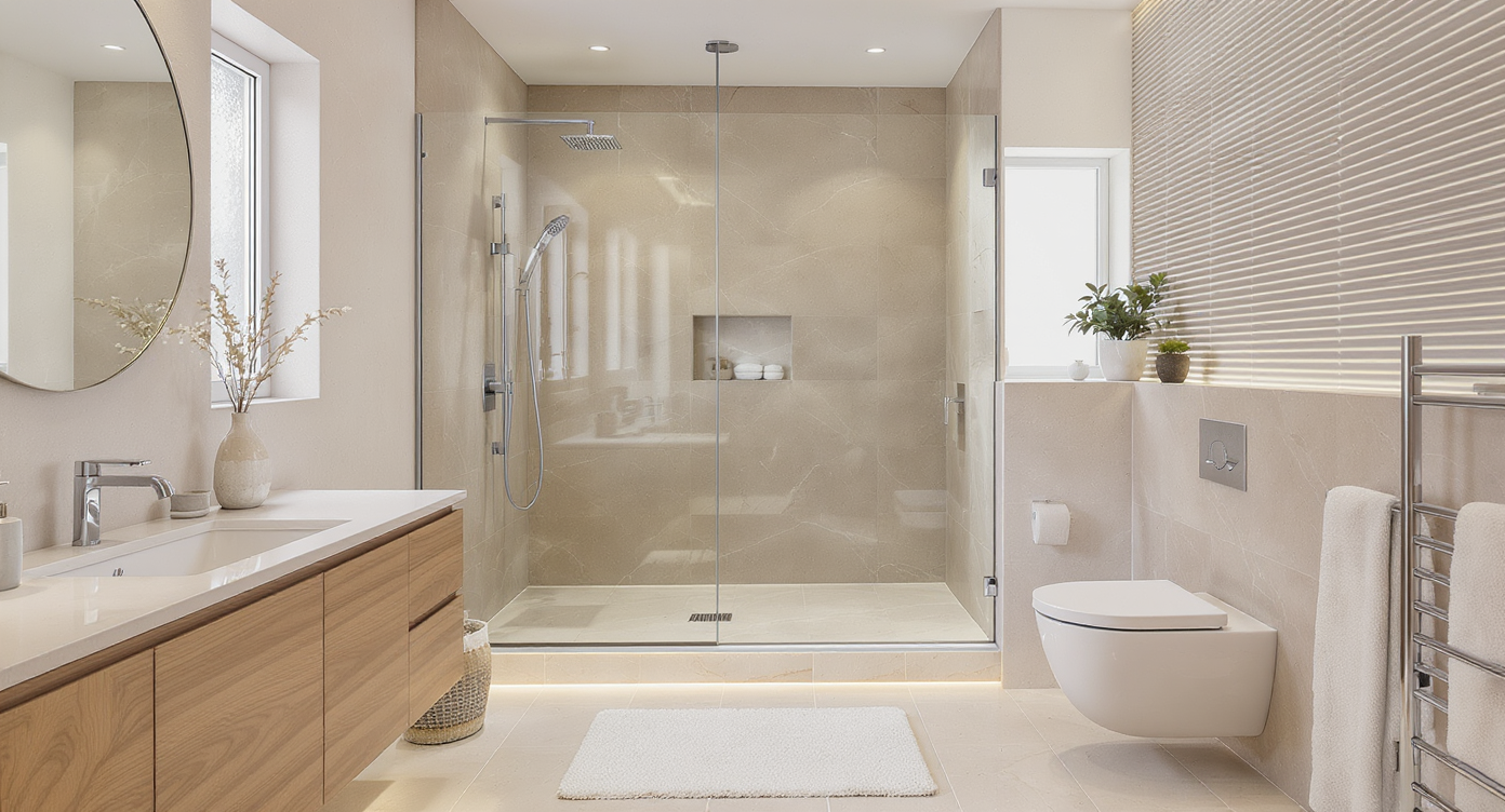 Eliminating a 4–6 inch curb creates true zero‑threshold access—one reason wet rooms continue to trend into 2025. The combination of accessibility, minimalist lines, and global style influences (Scandinavian and Japandi especially) makes open showers a modern decor staple. But three realities shape whether you’ll love daily life with one: thermal comfort, water management, and finish durability. - Thermal comfort: Radiant heated floors can lift surface temperatures to the 80–85°F range, taking the sting out of tile on winter mornings. A bath fan with a built‑in heater delivers fast spot warmth post‑shower. Extending glass to 7 feet high or closer to the ceiling reduces drafts while keeping the open look. - Water management: Plan a 2% floor pitch toward a linear drain along the far wall or entry line. Place hand‑showers and rain heads to direct spray away from openings. In tight rooms, a wider splash panel (42–48 in.) contains more mist than a narrow one. - Finish durability: Textured porcelain tile (aim for wet DCOF ≥0.42) and epoxy grout stand up to daily soaking. If you love fluted or ribbed wall tile, pair it with a smooth, slip‑resistant floor and commit to regular soft‑brush cleaning. This is where AI design tools help. With room makeover AI, you can preview glass widths, drain positions, and tile textures before committing, so your open shower reads “spa” instead of “splash zone.”